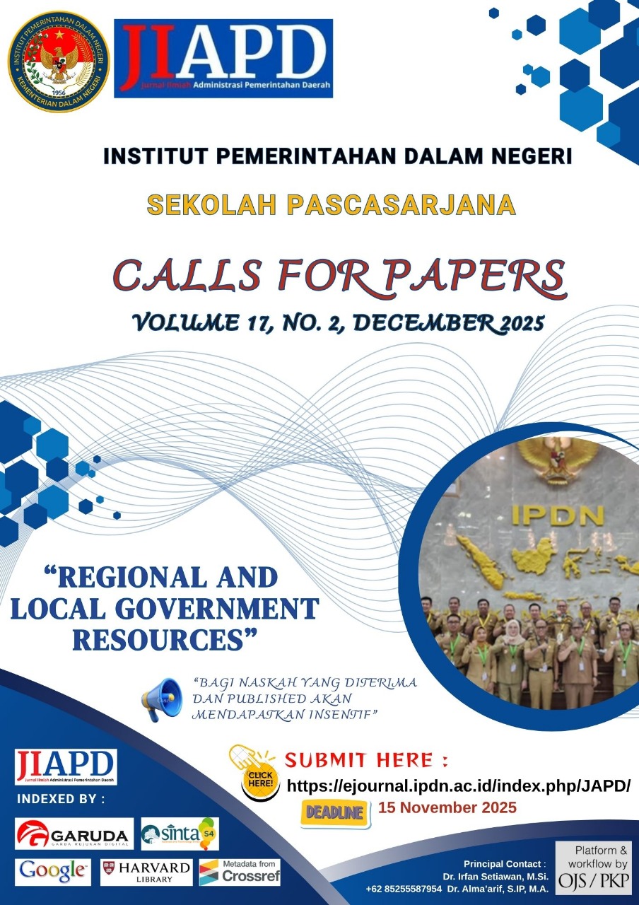 Jurnal Ilmiah Administrasi Pemerintahan Daerah (JIAPD) is a peer-reviewed journal published by the Sekolah Pascasarjana Institut Pemerintahan Dalam Negeri, dedicated to advancing scholarly discussion and empirical research in the field of regional and local governance, public administration, and policy studies. We welcome contributions that enrich theoretical insights, offer practical solutions, or provide comparative perspectives on the governance of local and regional resources. Join us in exploring how regional and local governments can harness their resources to build resilient, inclusive, and sustainable governance.