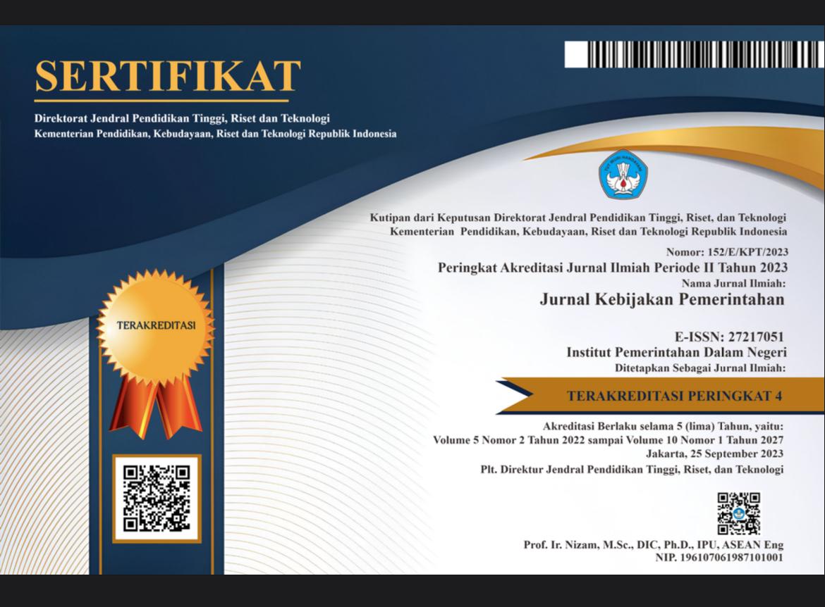 Jurnal Kebijakan Pemerintahan (ISSN 2599-3534; e-ISSN 2721-7051) is a peer-reviewed journal published by Fakultas Politik Pemerintahan IPDN. Journal Kebijakan Pemerintahan aims to facilitate writing both research results as well as literature study and scientific writing in the field of government policy. Therefore, Journal Kebijakan Pemerintahan publishes articles that promote new ideas, models, approaches and paradigms in order to contribute to the advancement of theory and policy implementation. The scope of this journal is: policy formulation, policy implementation and policy evaluation.