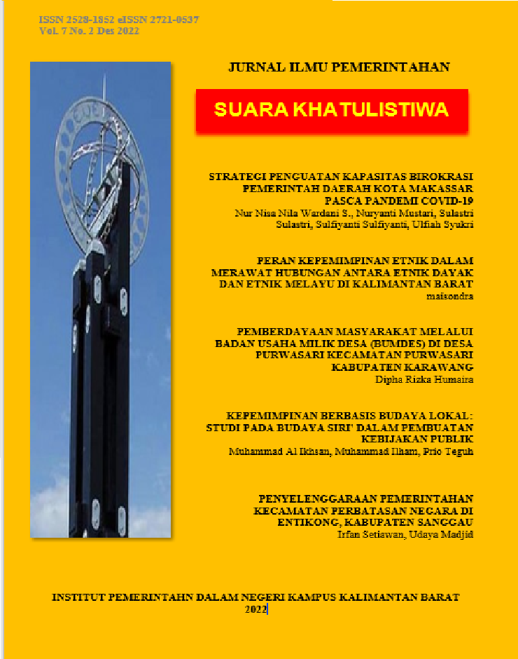 Vol. 5 No. 2 (2020)Jurnal Ilmu Pemerintahan Suara Khatulistiwa (JIPSK) is a scientific journal published by the Institut Pemerintahan Dalam Negeri (IPDN), West Kalimantan Campus, containing theoretical concepts and research results in government science, after going through an assessment process by reviewers. Selected articles from the review process in this journal from 2020 published by Vol. V Number 1 is published in an online version which is freely accessible and in a printed version. The management of this journal is uploaded with the Open Journal System (OJS). While the printed version of this journal was published starting in 2016 and accredited SINTA 5 by Indonesian Journal Accreditation Agency (ARJUNA)